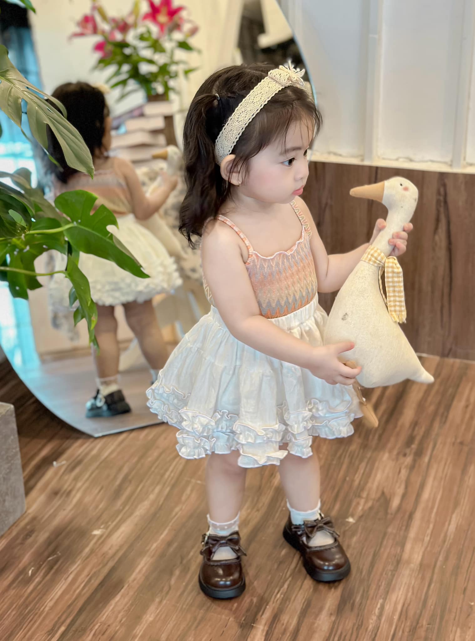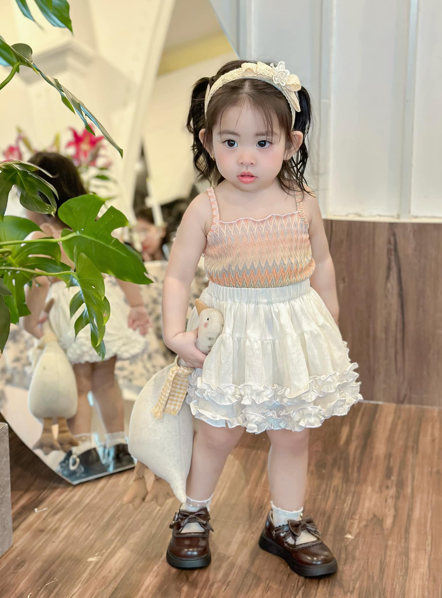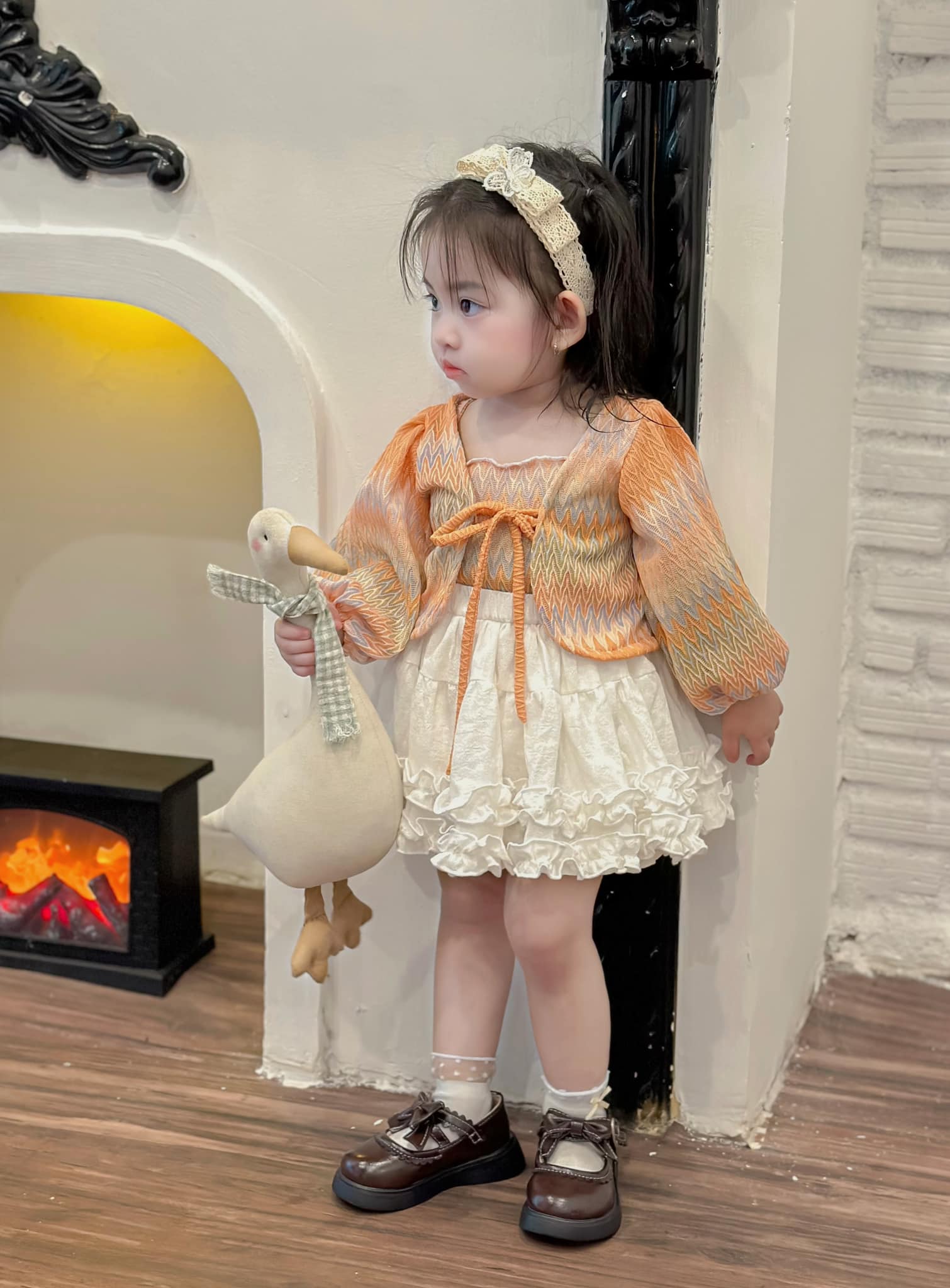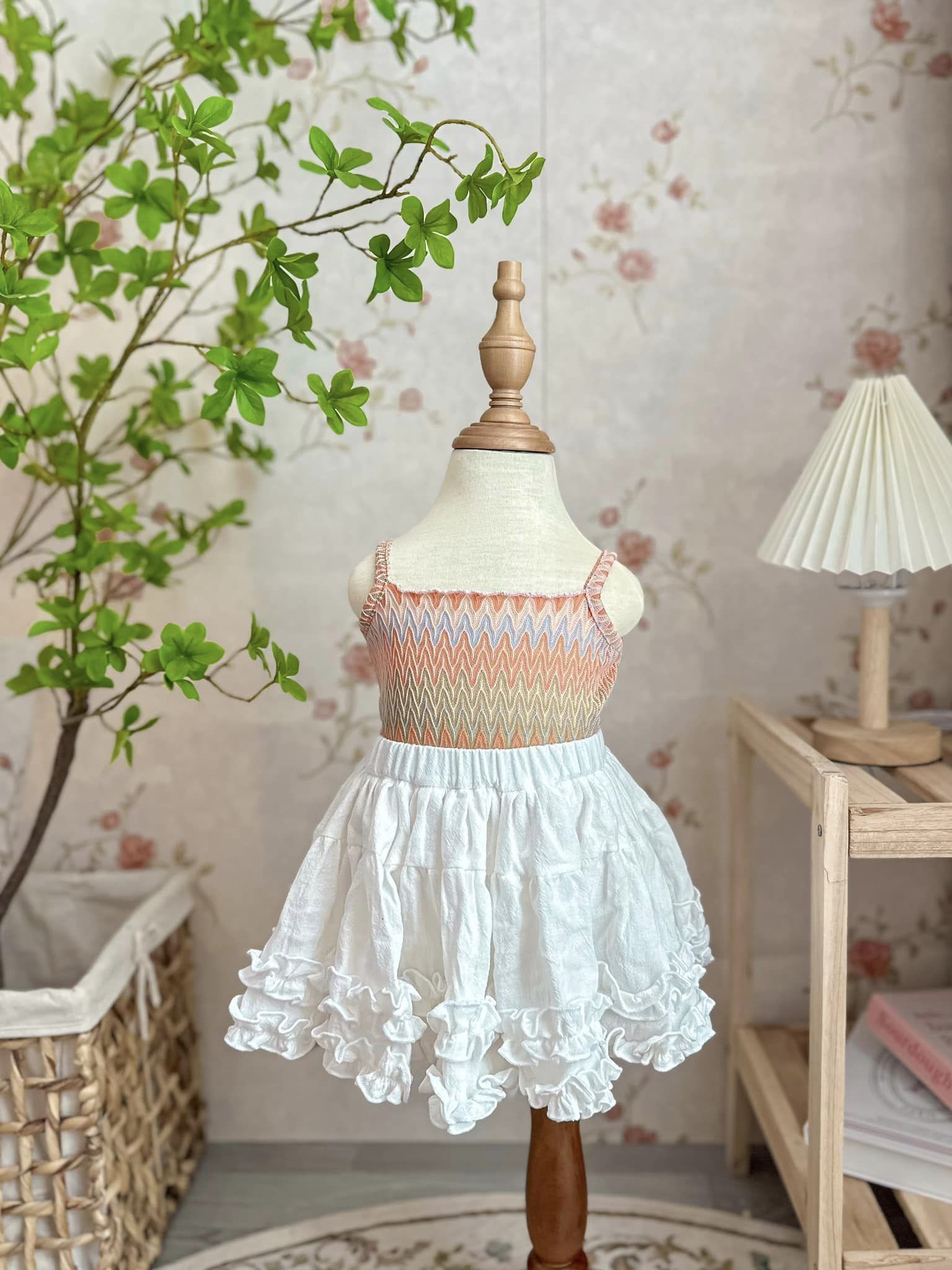 Set đồ xinh kèm khoác cho bé. Chân váy bồng bềnh, mẹ phối với áo gì cũng xinh. Chất thun lưới nên mẹ không lo nóng quá đâu ạ.