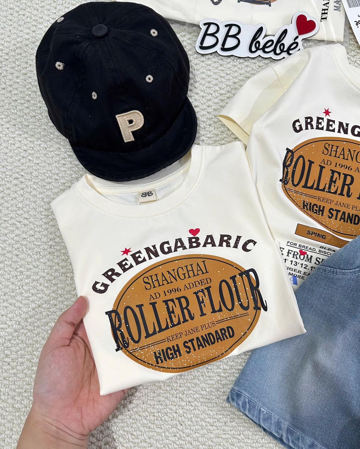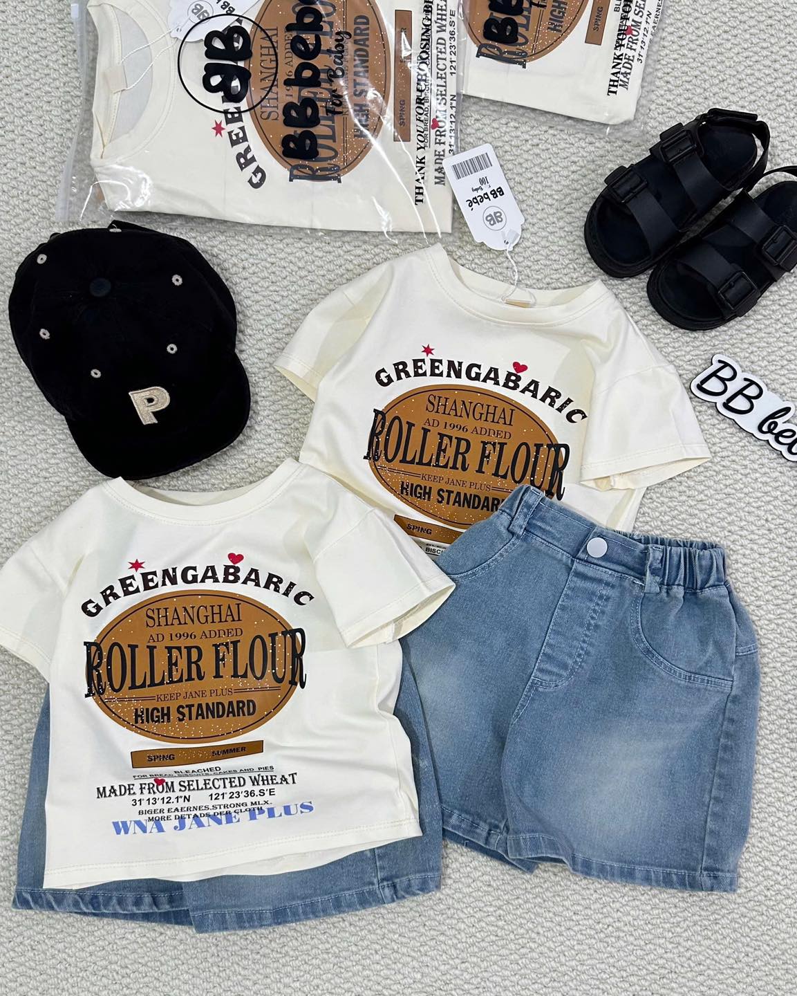 🍀SÉT BỘ ÁO PHÔNG KEM ROLLER FLOUR QUẦN SHORT JEAN CHO BÉ NEW1️⃣1️⃣5️⃣🐟