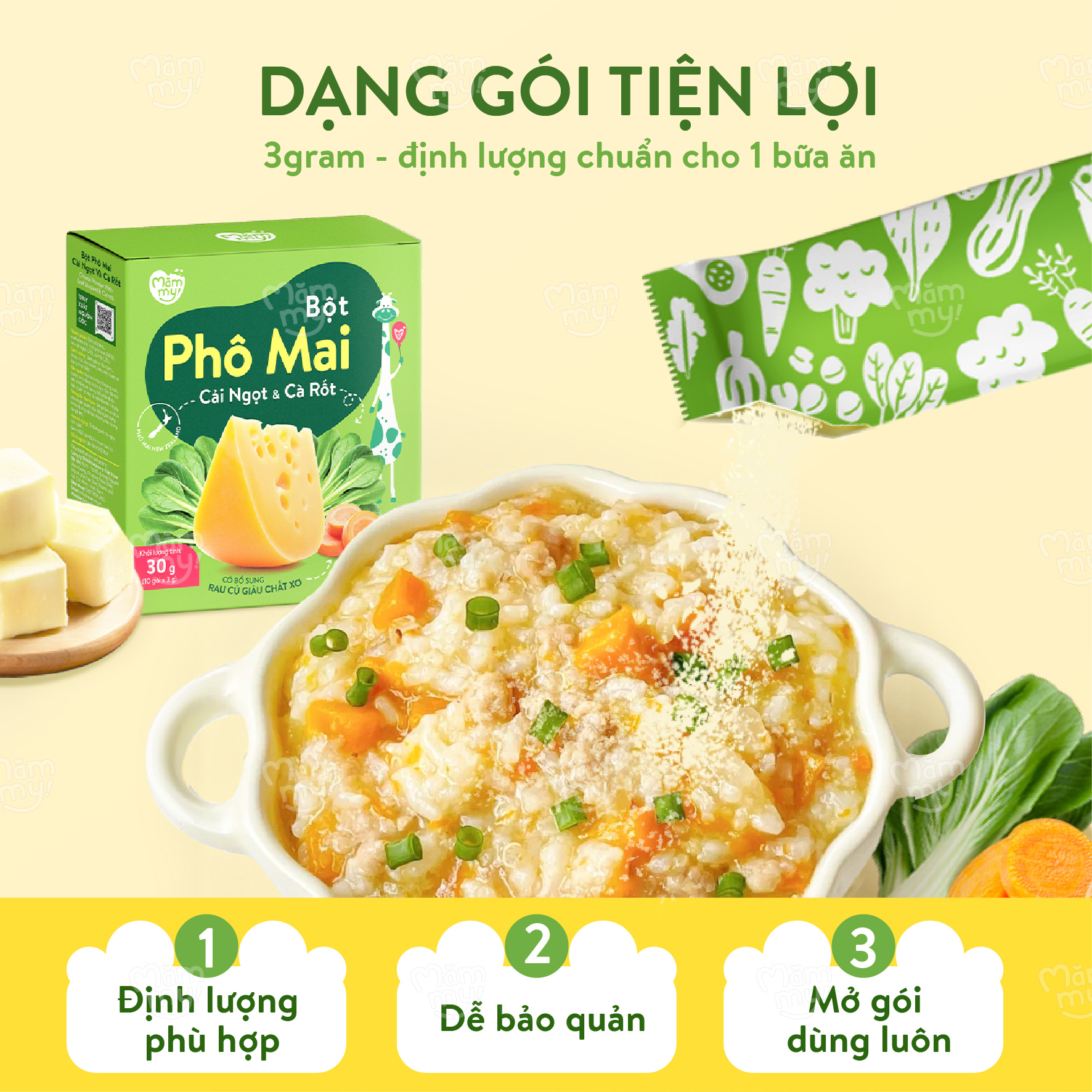 Nhiều ba mẹ chia sẻ với Mămmy rằng bé rất mê phô mai, thậm chí phải trộn vào cháo mới chịu ăn, nhưng ăn liên tục cả tuần thì lại lo con bị nóng trong. Bột phô mai rau củ nhà Mămmy ra đời chính là để “gỡ rối” cho ba mẹ 😘