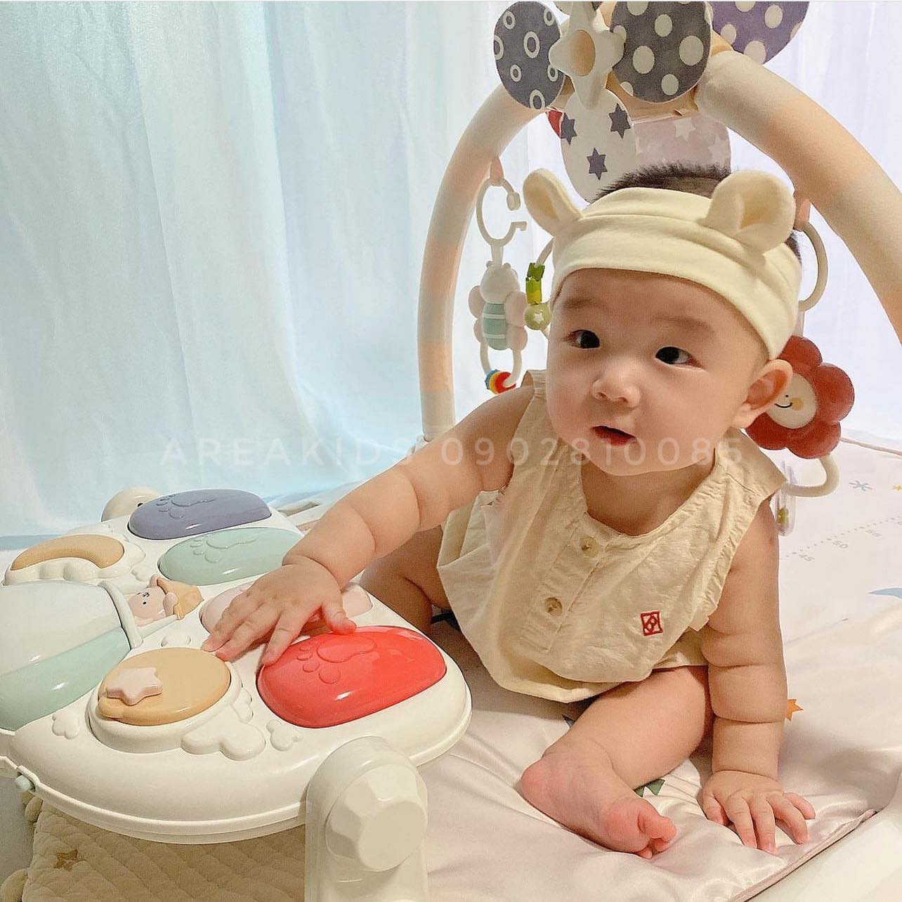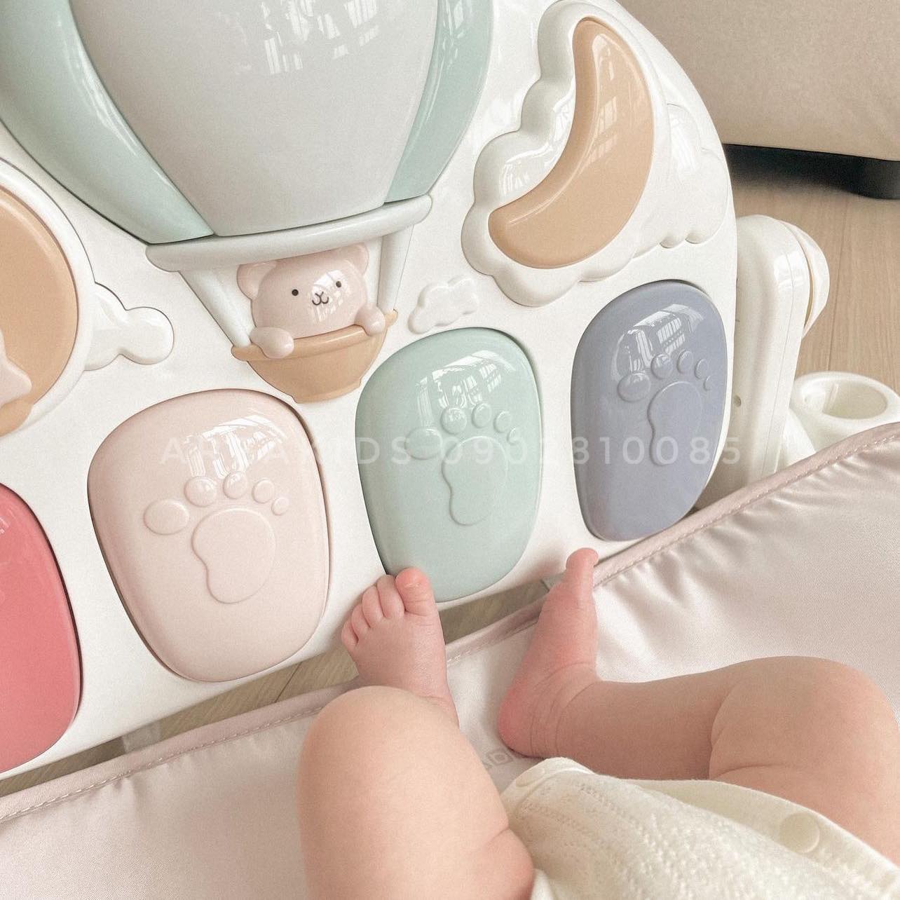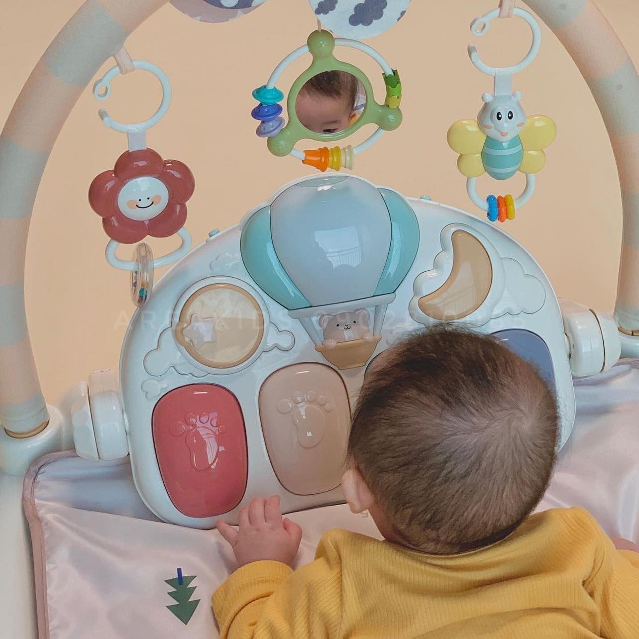 ➖ Khi bé duỗi chân và đạp vào các phím piano sẽ phát ra nhiều âm thanh khác nhau và đèn lấp lánh giúp bé thích thú và chủ động hoạt động chân nhiều hơn.