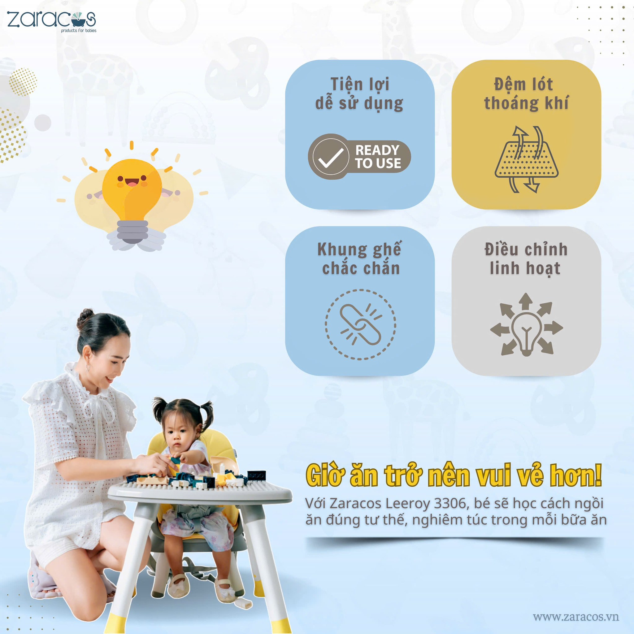 ✨ Hình thành thói quen tốt từ sớm: Với Zaracos Leeroy 3306, bé sẽ học cách ngồi ăn đúng tư thế, nghiêm túc trong mỗi bữa ăn.