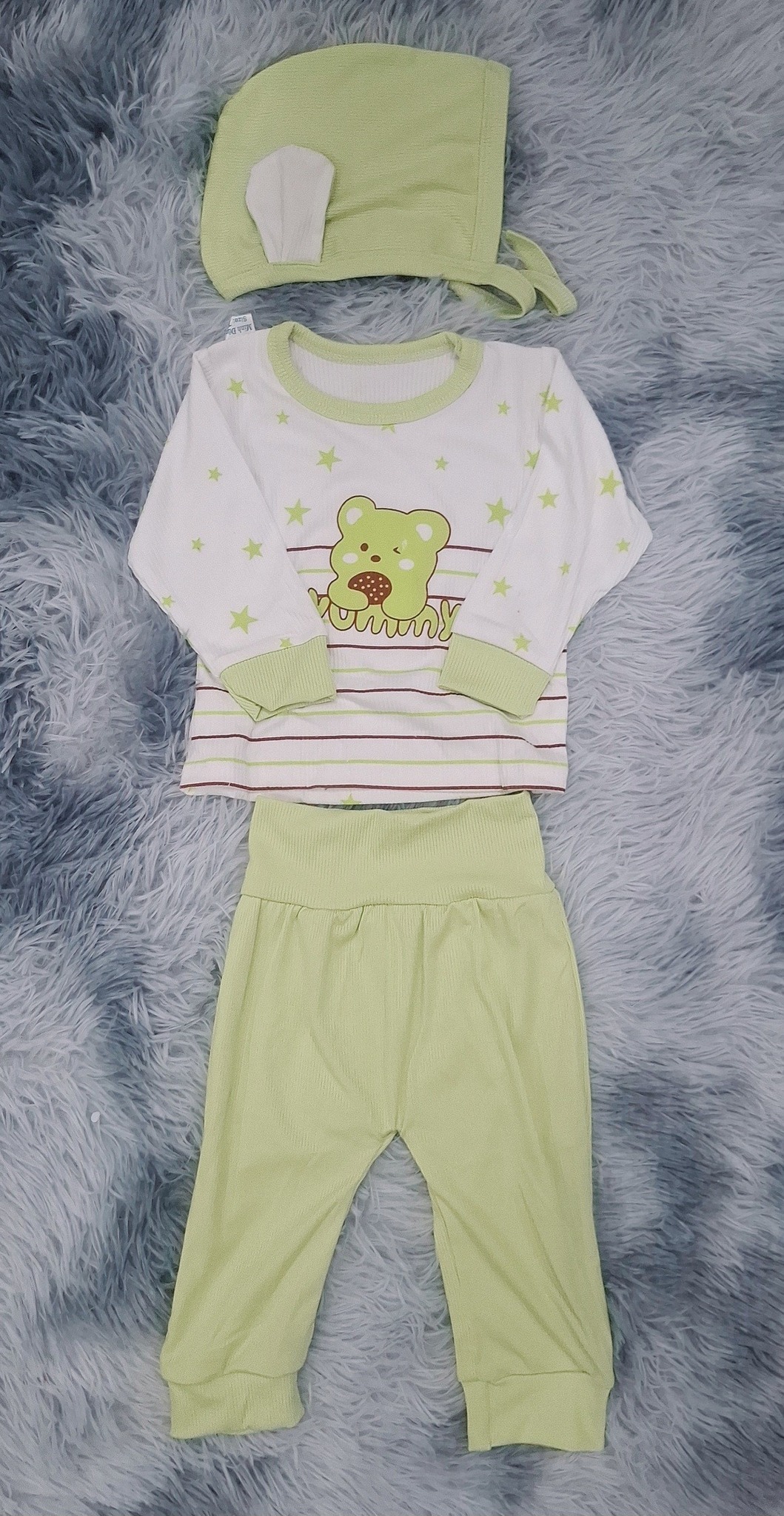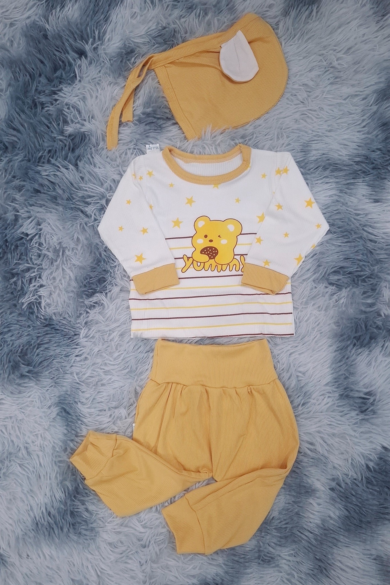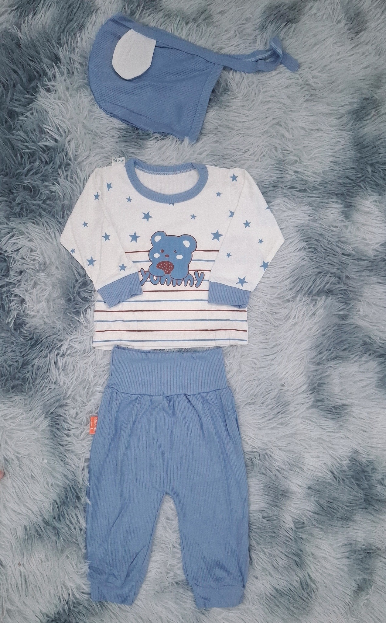 Set 3 món nha : mũ tai thỏ dây cột, áo tay dài, quần dày cạp cao.