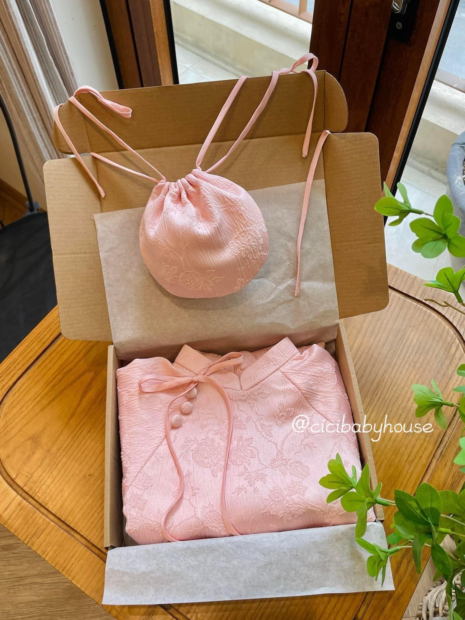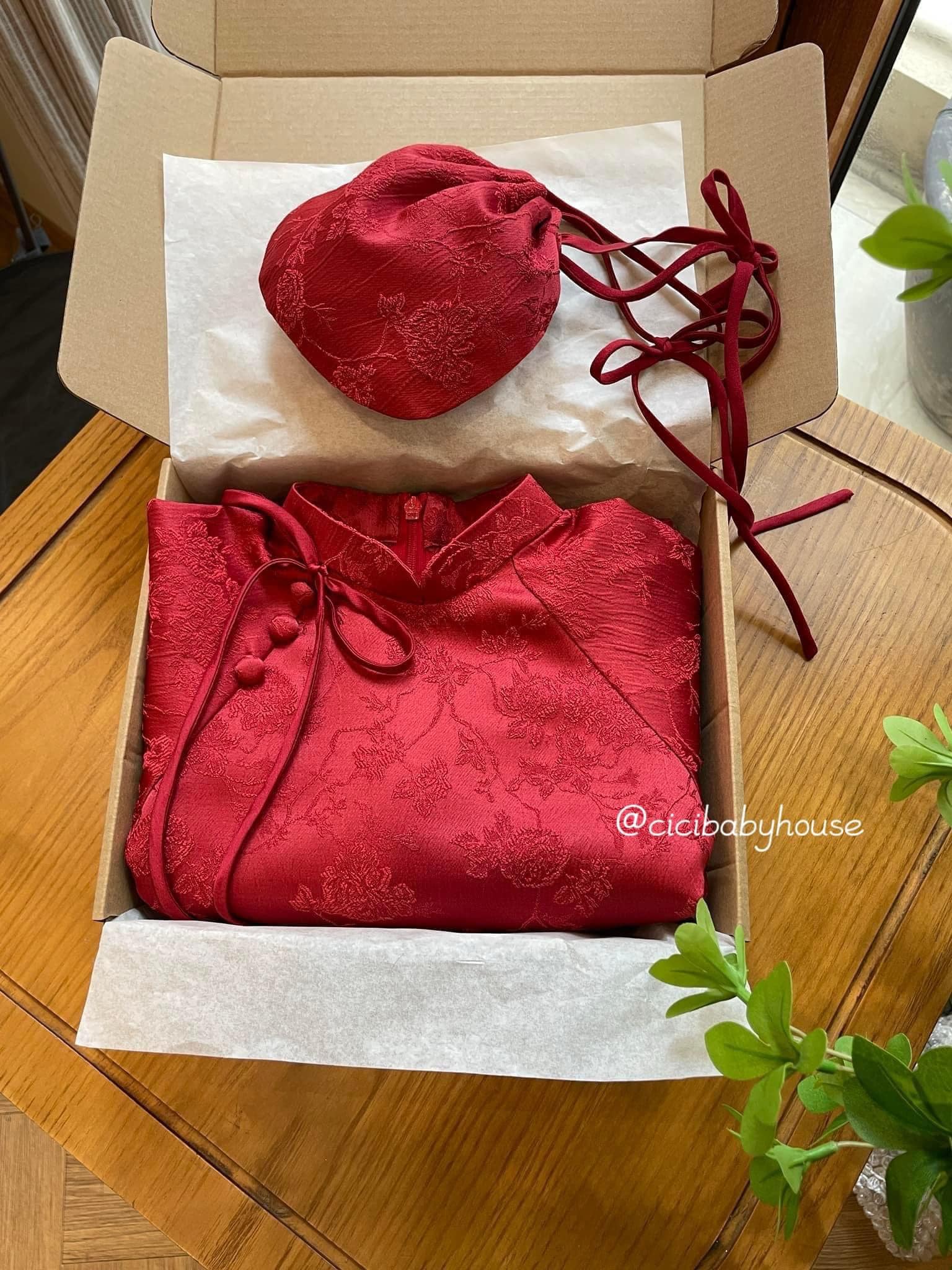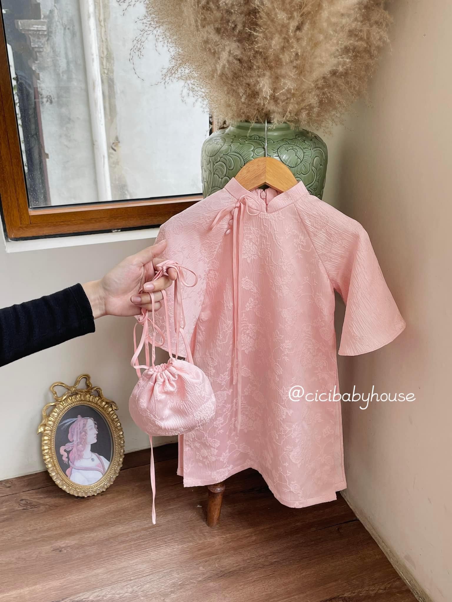 Em mở pre- order áo dài Tết rồi đây. Vải gấm vân nổi cao cấp và quần lụa, em tặng túi tròn rút dây, các bé tết cầm đi đựng lì xì bao cưng 🥰