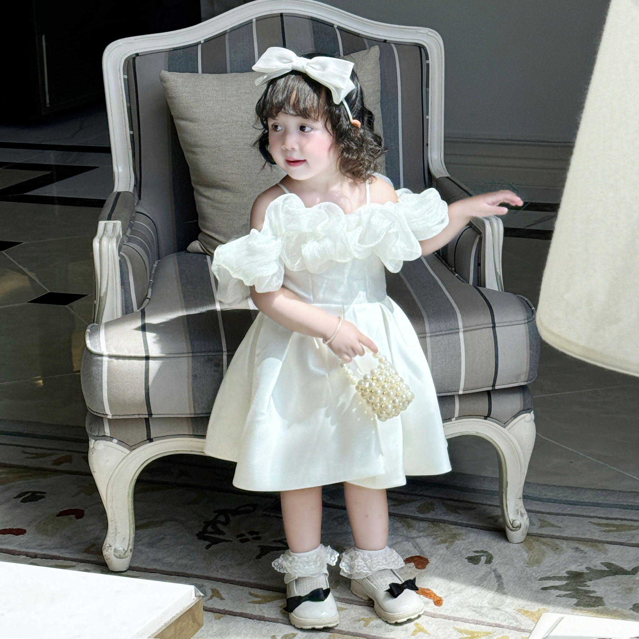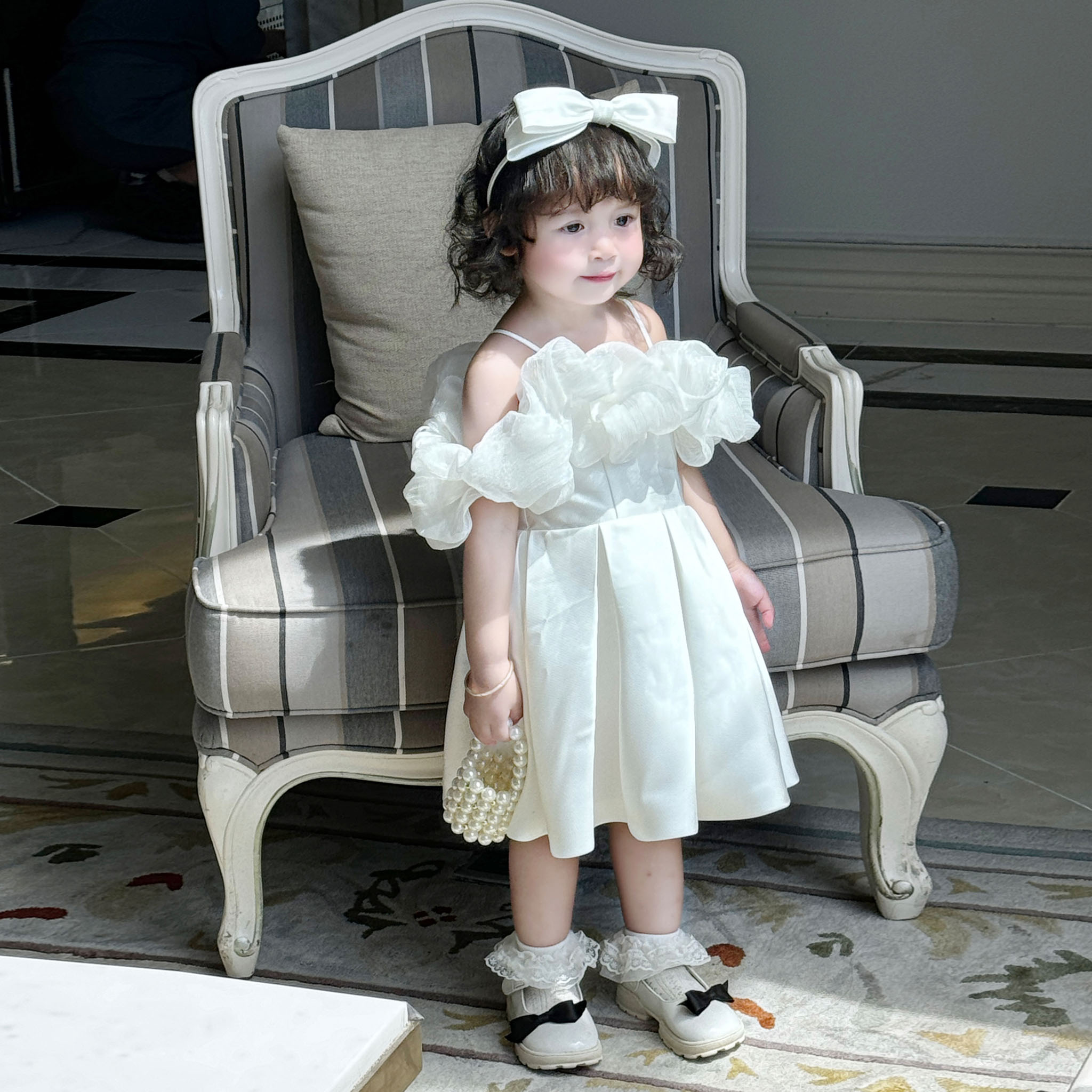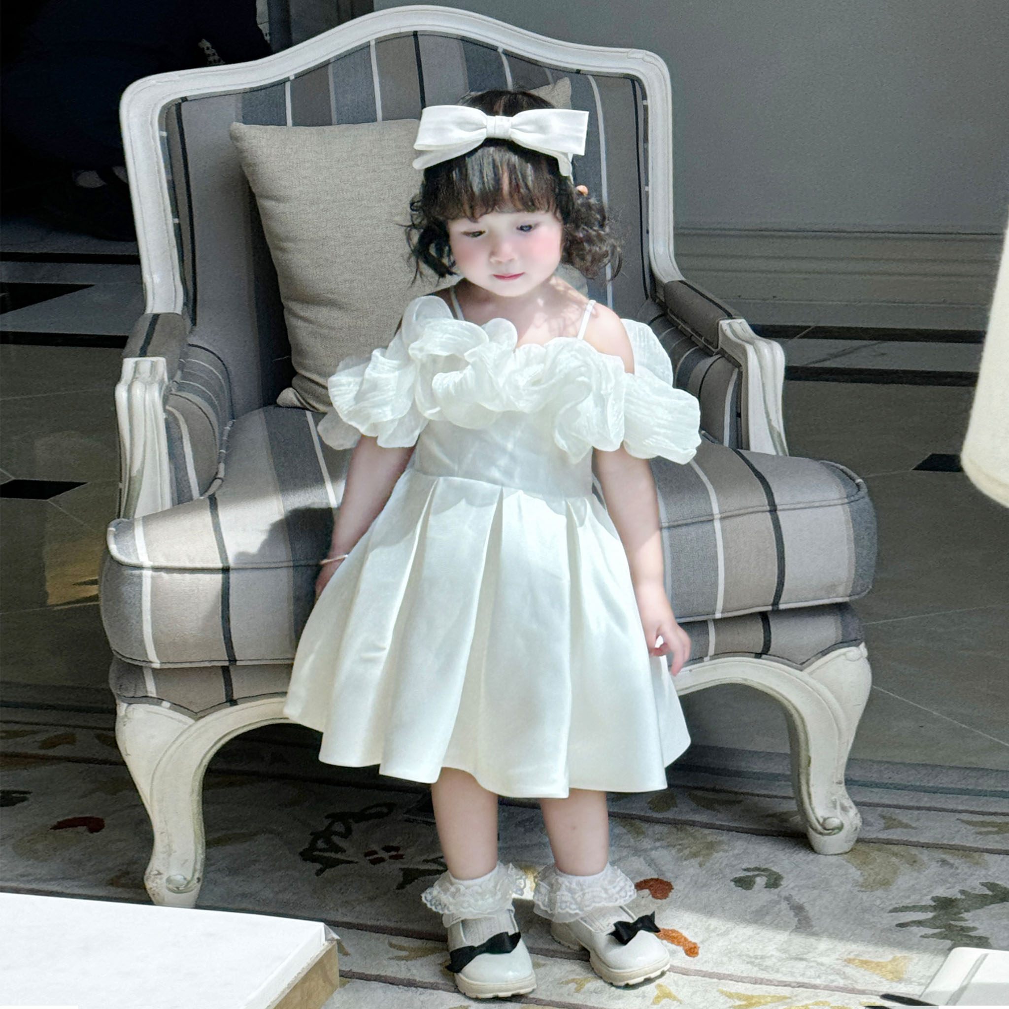 Điểm nhấn nằm ở phần tay áo được làm từ voan lụa cao cấp, với thiết kế phồng và chân váy xòe nhẹ tạo nên vẻ ngoài thanh lịch và đáng yêu cho bé.