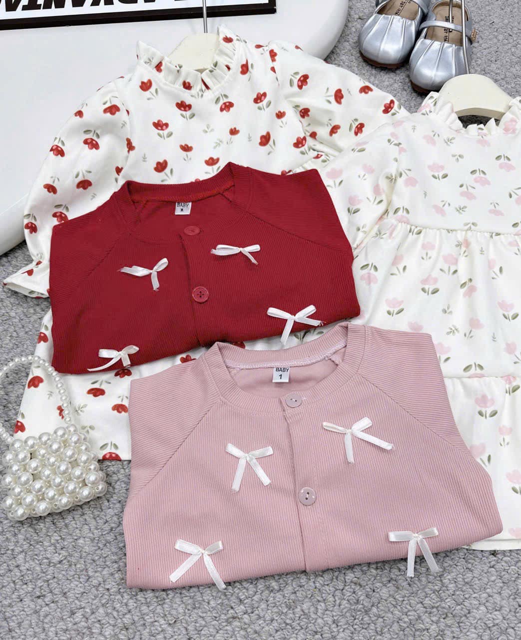 🔥 Chỉ 99K - Set váy thu đông hoa nhí đỏ mix áo len đính nơ siêu xinh cho bé gái! 🔥